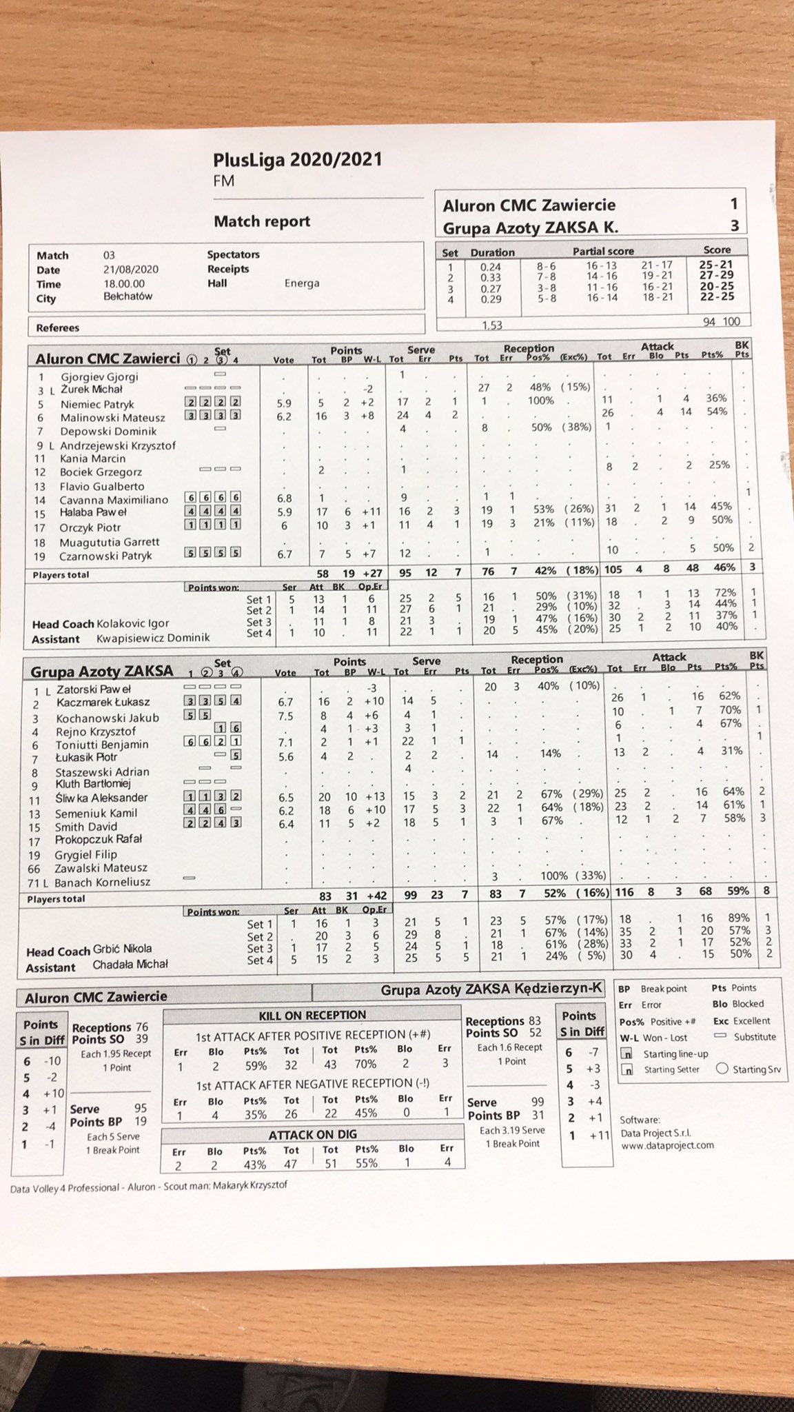 Aluron CMC Zawiercie - GA ZAKSA Kędzierzyn-Koźle 1:3 (25:21, 27:29, 20:25, 22:25) MVP: Śliwka - Staty